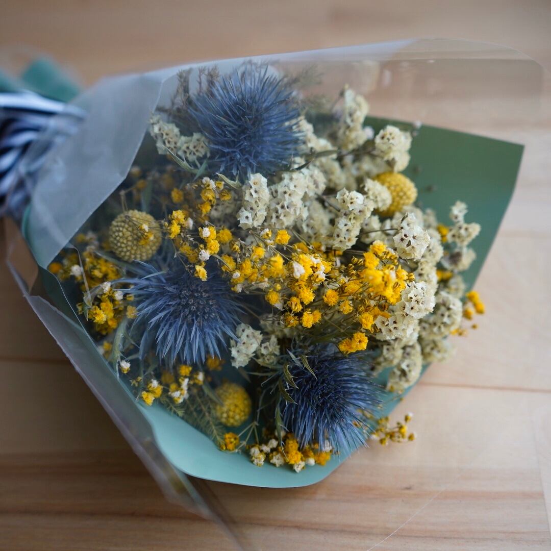 ブルーのエリンジュームが綺麗なドライフラワーブーケです。